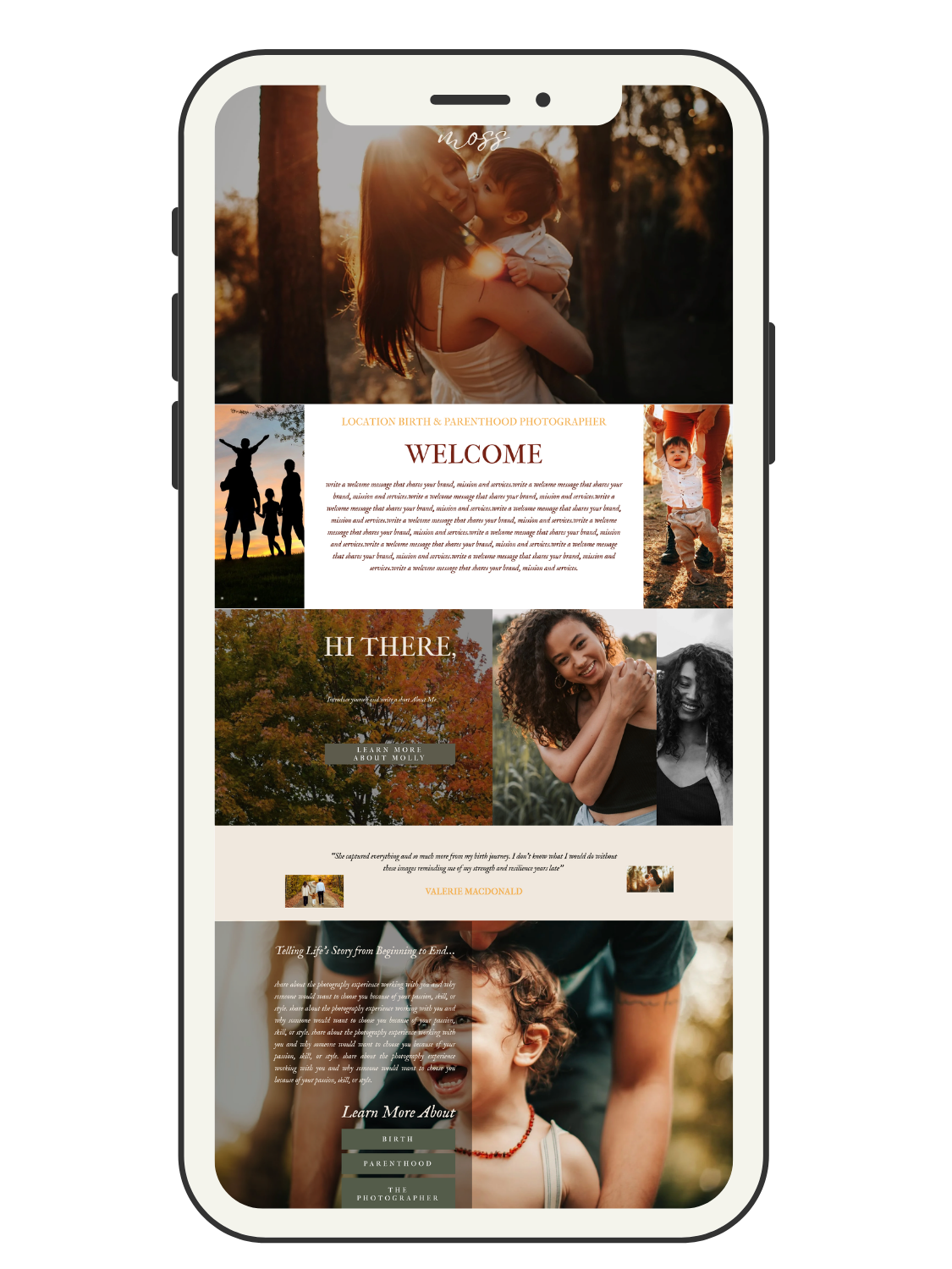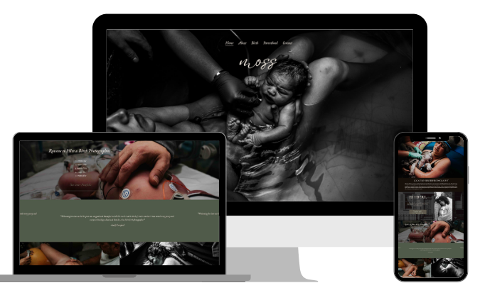Moss was created for birth photographers out there who want to stand out! The one who feels the rawness of birth, the grit, the power, and isn’t afraid to show it. It carries an earthy foundation with a little edge. A layout that lets your images hit the way they’re meant to, honest, emotional, and unforgettable. This is for the birth worker who doesn’t want a soft, whispery online presence.